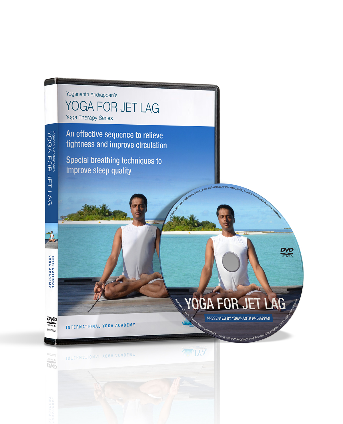 Yogananth Andiappan's Yoga for Jet Lag practice DVD features a 50 minutes sequence to relive tightness and fatigue for frequent travelers and busy executives. This includes special breathing techniques to improve sleep quality.